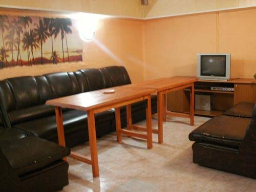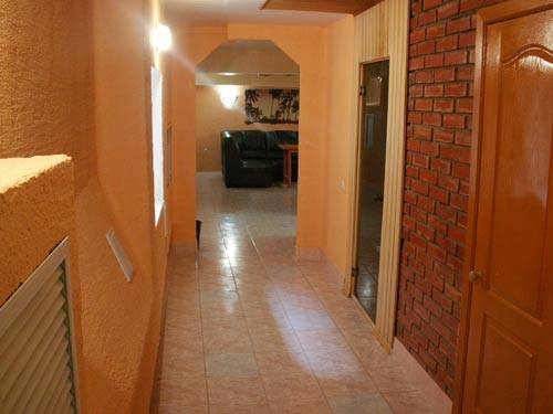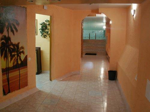 В данной сауне, отдельно есть "комната отдыха". Места достаточно для небольшой компании. Там имеется душ/туалет/умывальник, затем сама просторная комната с угловым диваном "типа кожа", журнальным столиком и теликом. Еще весомый бонус - слева деревянная лестница "типа на второй этаж". В целом, обстановка уютная, в ванной кафель, в комнатах ковролин.